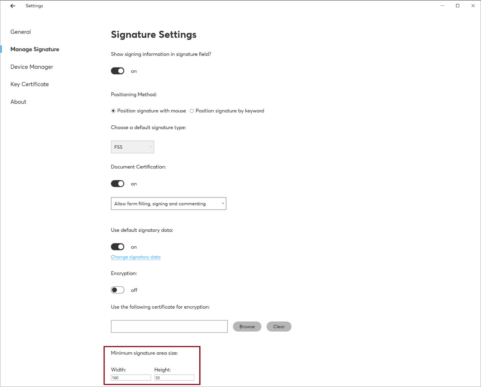 An option exists to set a minimum size for a signature box. This can be done by going to sign pro’s Settings -> Manage Signature.